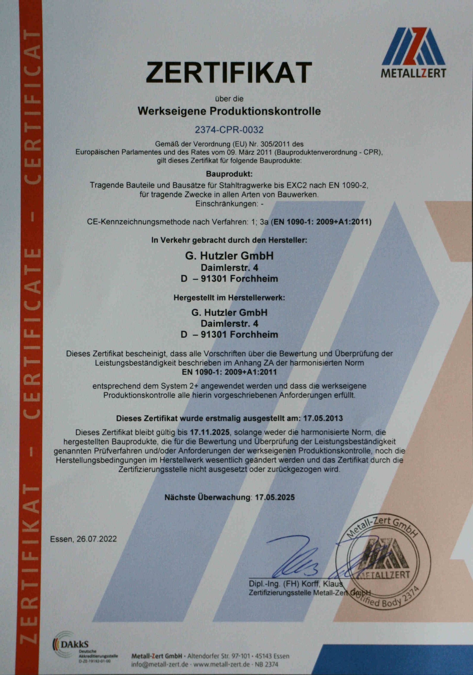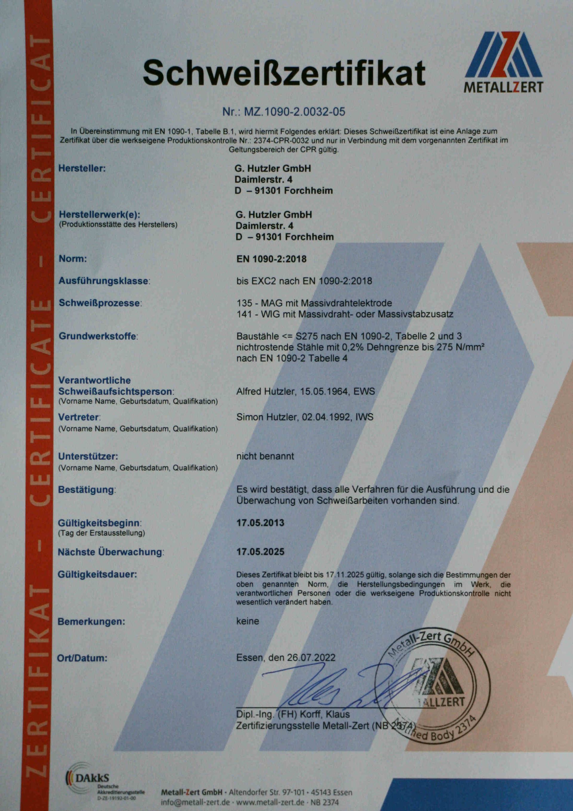Die Qualität unserer Kernkompetenzen wird durch unsere Zertifikate bestätigt, die bescheinigen, dass unsere Gewerke/Produkte immer unter Einhaltung der Zertifikate EN1090 WPK (Produktionskontrolle) und EN1090-EXC-2 gefertigt werden.